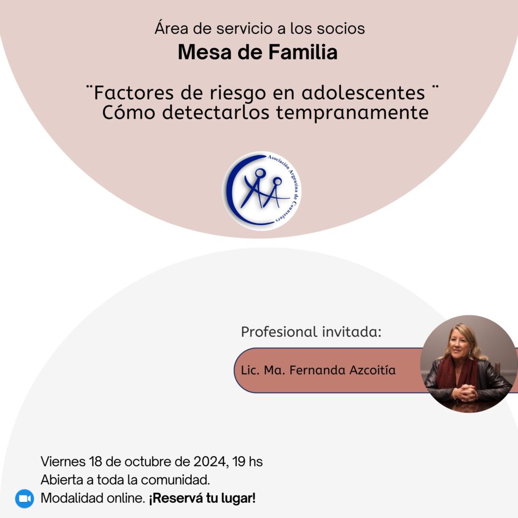 Desde la Mesa de Familia te invitamos a ver la disertación de la Lic. Ma. Fernanda Azcoitía, en calidad de Presidente del C.A.S. Centro de Asistencia al Suicida) quien compartió una temática que atraviesa a muchas familias: Factores de riesgo en adolescentes – Cómo detectarlos tempranamente