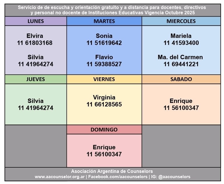 Desde la Asociación Argentina de Counselors nos enorgullece ofrecerles el Servicio de Escucha y Orientación Gratuito y a Distancia para Docentes, Directivos y Personal no docente de instituciones educativas.