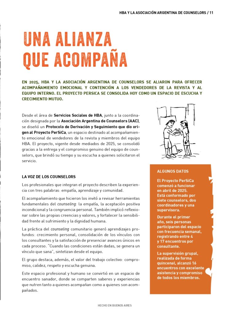 Desde el área de Servicios Sociales de Hecho en Buenos Aires, junto a la coordinación designada por la Asociación Argentina de Counselors, se diseñó un Protocolo de Derivación y Seguimiento que dio origen al Proyecto PerSiCa, un espacio destinado al acompañamiento emocional de vendedores de la revista y miembros del equipo HBA.
